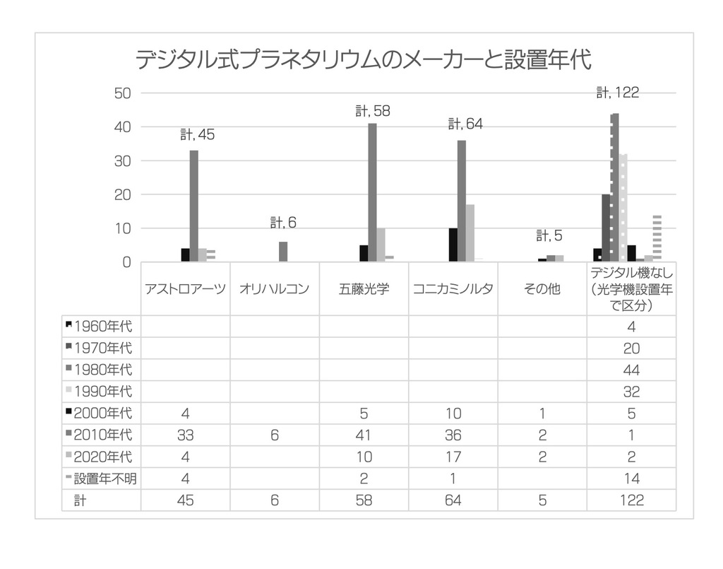 デジタル式プラネタリウムのメーカーと設置年代 クリックすると大きくなります。