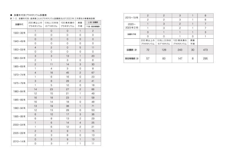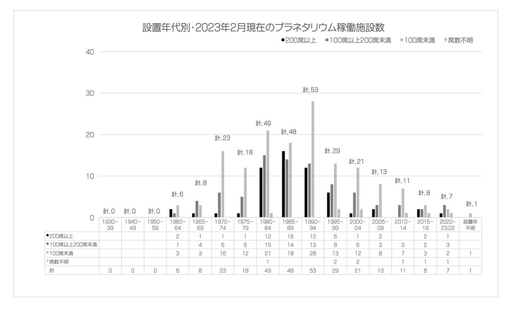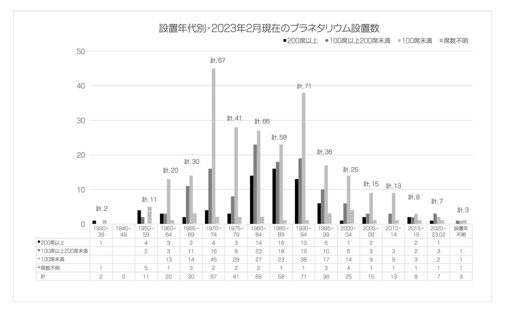 2023年2月現在の設置年代別・プラネタリウム設置数/稼働施設数の一覧表です。クリックすると大きくなります。