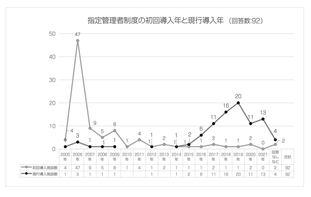 指定管理者制度の初回導入年と現行導入年 クリックすると大きくなります。