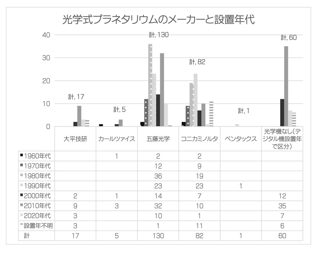 光学式プラネタリウムのメーカーと設置年代 クリックすると大きくなります。