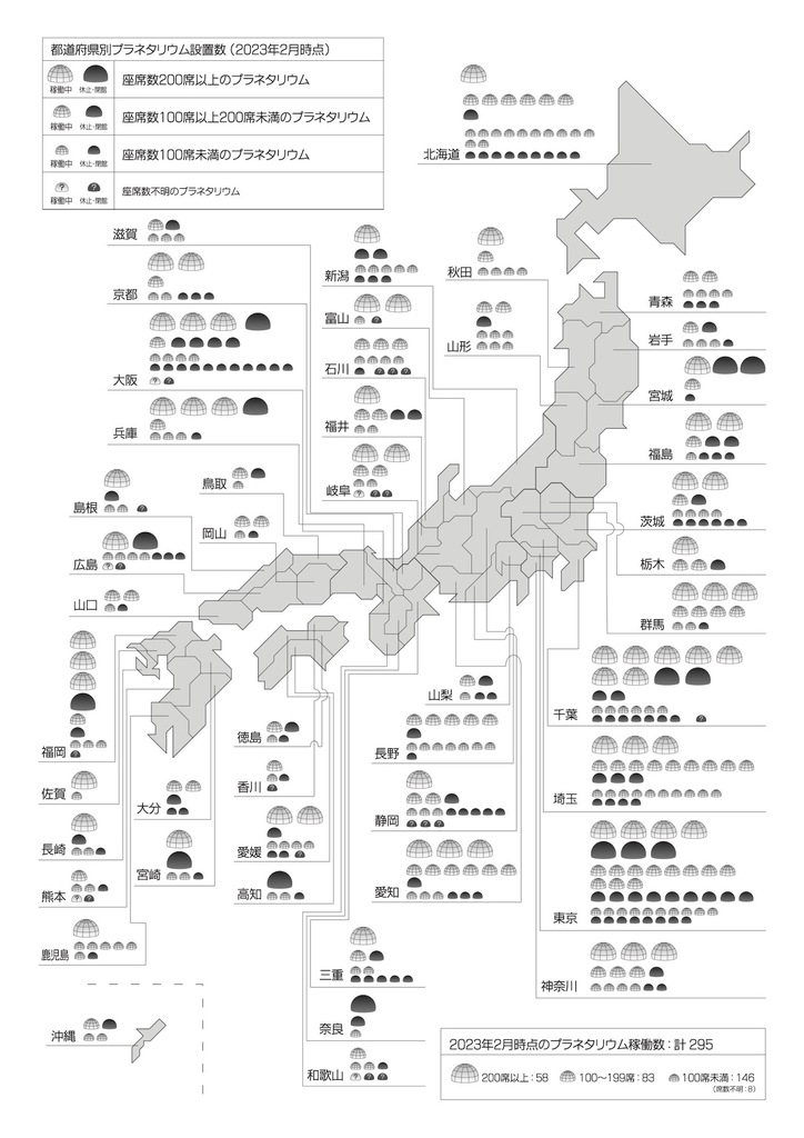 日本には473施設のプラネタリウムが作られ、そのうち295施設が稼働中です。