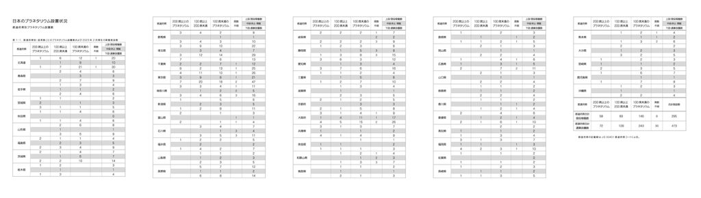 この表の中の都道府県_番号を施設の固有番号として扱い、件数などを計数しています。基本ルールとして同一場所での建て替えは固有番号を継続し、住所変更を含む移転は新しい固有番号を振っています。同一場所においても大きく運営母体が変わった場合は別番号を振りますが、同じ地方自治体の中での移管、名称変更等は同じ番号を振っています。この関係で同一施設が開館時とリニューアルで座席数が変わり、規模の区分(座席数で区分)が以前のデータブックと変わるという場合が頻出しています。